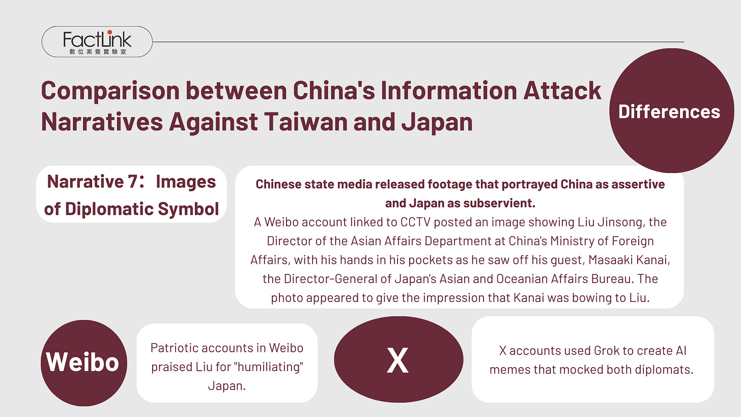 The seventh category features messaging from the CCTV-affiliated account “Yuyuan Tantian,” which posted an image of China’s Director General for Asian Affairs, Liu Jinsong, in uniform, hands in pockets, while Japan’s Director General for Asian and Oceanian Affairs, Kanai Masaaki, was shown bowing respectfully as the two bid goodbye. The imagery symbolized China as dominant and Japan as submissive. Subsequently, a large number of political memes mocking Japanese diplomats were shared on X.