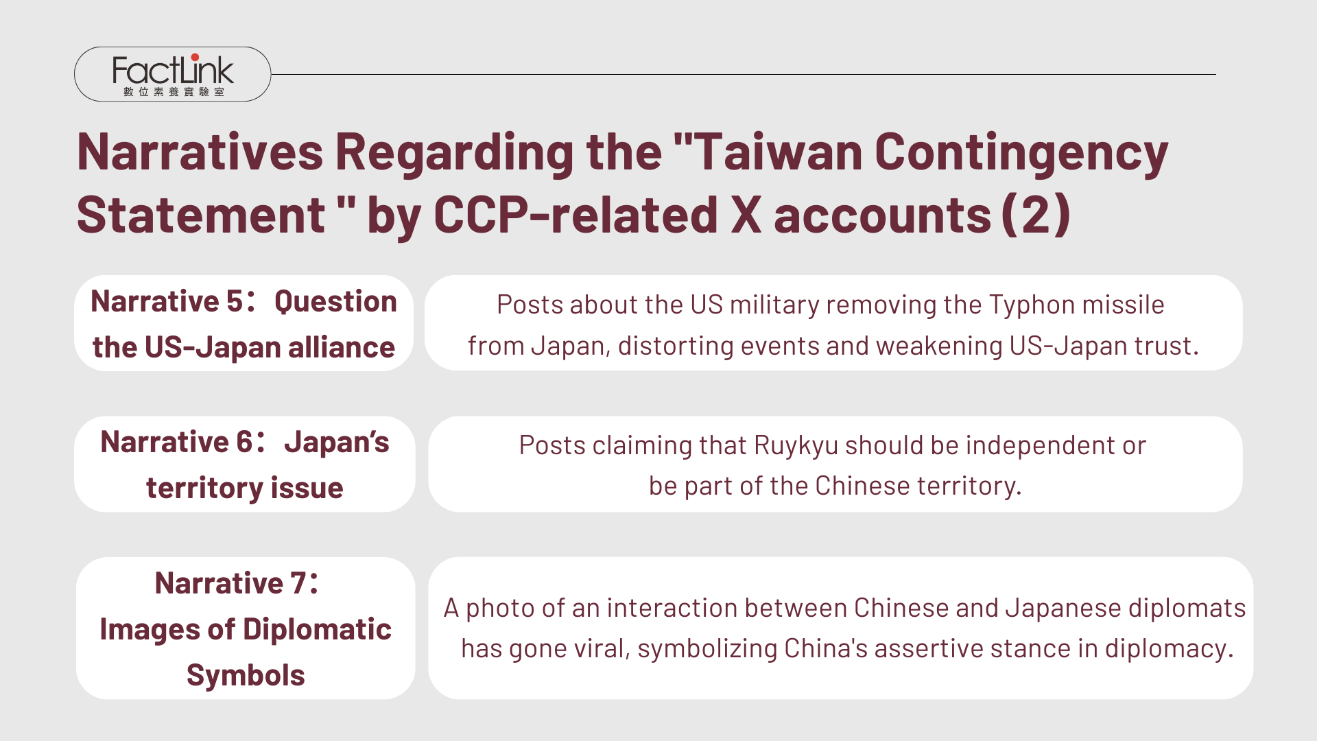 Based on extensive experience in fact-checking disinformation in Taiwan and the Chinese-language information sphere, the FactLink team examined the similarities and differences in the CCP’s information and propaganda strategies against Taiwan and Japan during “diplomatic red line” incidents from a Taiwanese perspective. It also offers insights from Taiwan’s frontline experience to our allies in Asia, including Japan, in developing information defense strategies.