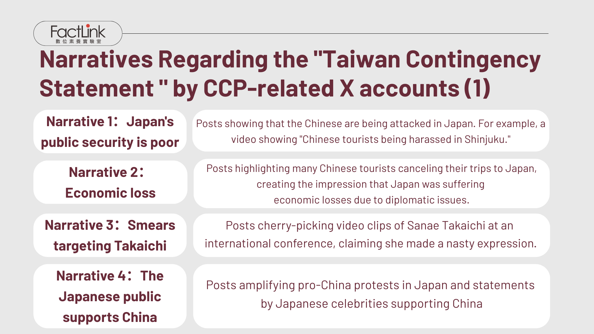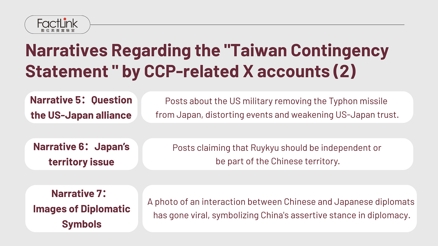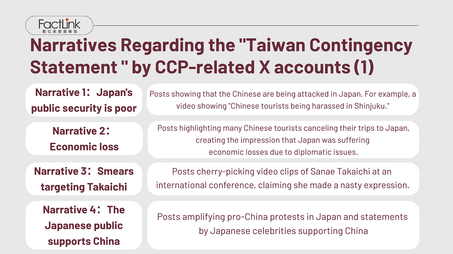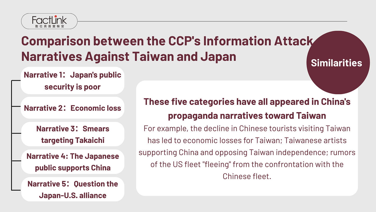 Among the seven narrative categories, the first five — Japan's deteriorating public safety, economic losses, smearing Takaichi, pro-China public opinion in Japan, and questioning the US-Japan alliance — have also appeared in the CCP's propaganda targeting Taiwan.