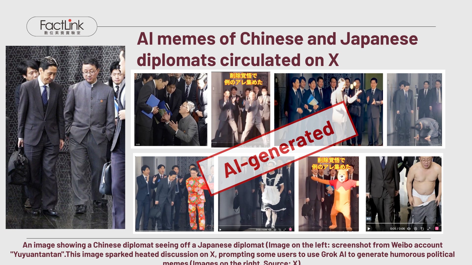 In response to Takaichi’s comments, the CCP’s Ministry of Foreign Affairs, the Chinese Embassy in Japan, and Ambassador Wu Jianghao issued condemnations. Notably, Consul General Xue Jian of the Chinese Consulate in Osaka posted a “beheading” message on X on November 8, 2025. Although it was quickly deleted, this incident triggered a diplomatic exchange between China and Japan. Chinese diplomats in Japan also launched attacks on social media in both Chinese and Japanese. Additionally, the Chinese official foreign propaganda outlet, China News Service [中國新聞網], actively posted news reports and AI-generated editorial cartoons on X. Chinese political-oriented online Weibo influencers (”大V”) with close ties to China also echoed the official narrative.